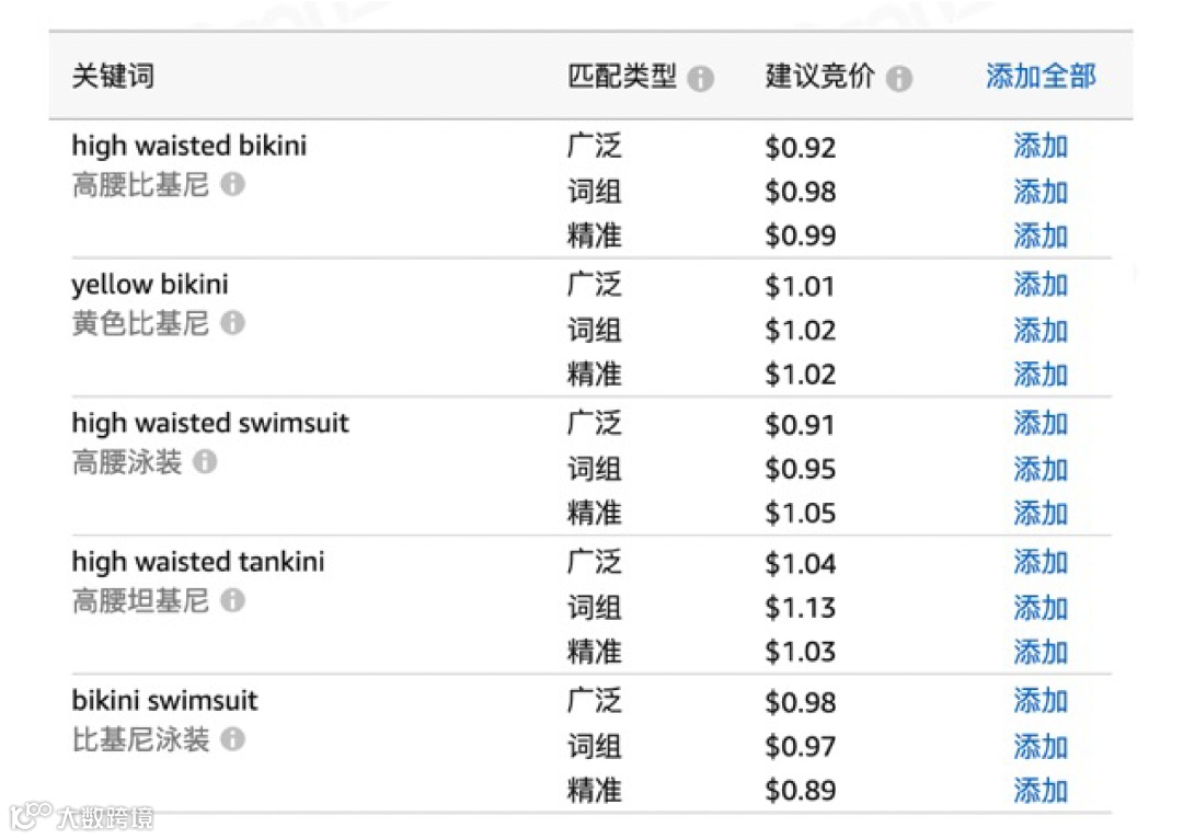 我们以比基尼 [ Bikini Swimsuit ]为例,系统推荐的词有高腰比基尼、黄色比基尼、高腰的swimsuit,关键词标签与产品的匹配度较高,是可以使用的,开启自动广告效率会更高。