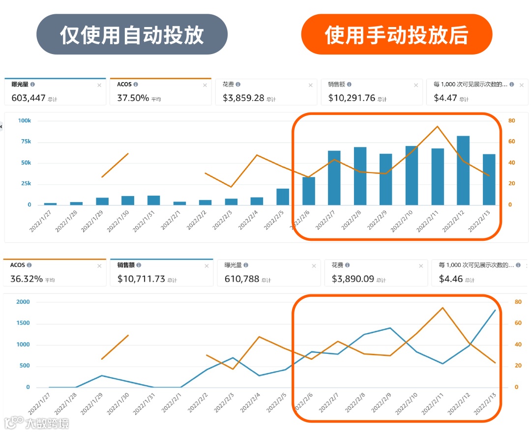 从下图可以看出,在新品上线初期,卖家仅开启了自动广告,销量数字并不那么理想;开始手动投放大词后,曝光和销量都有显著提高,ACOS也渐趋稳定。