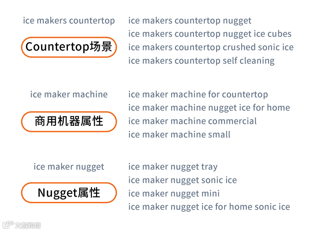 以产品家用制冰机 [ ice maker ]为例,在瀑布词中出现的两个相近词,但经过搜索,我们发现虽然同样是制冰的机器,但三个产品的属性不一样的:商用制冰机ice maker machine和方形冰块制冰机ice maker nugget都不属于家用制冰机的范畴,会带来一些无关的流量,我们可以在投放时将相关的词进行否定(如下图)。