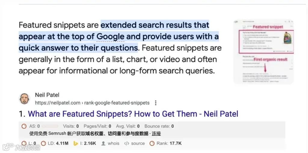 增加品牌可见性:出现在精选摘要中,意味着你的网站在搜索结果中占据了更重要的位置,增加了品牌曝光度。