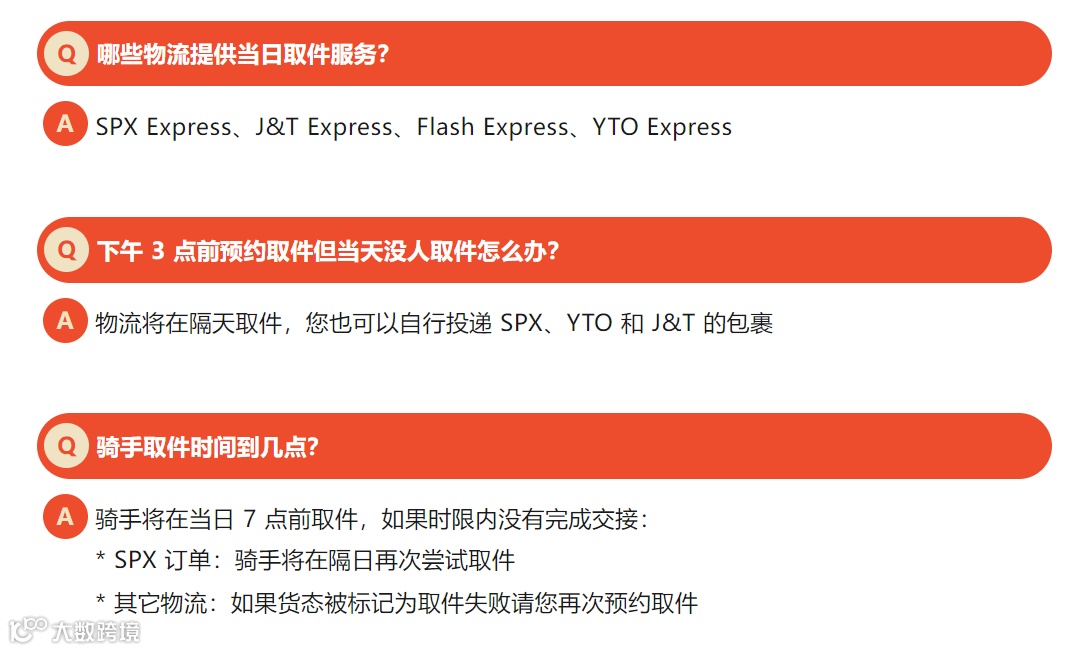 Shopee菲律宾站发布公告称,11月28日起,当日取件的预约截止时间将从上午 10 点更改至下午 3 点,Shopee提醒卖家尽快利用当日取件功能加速出货速度!