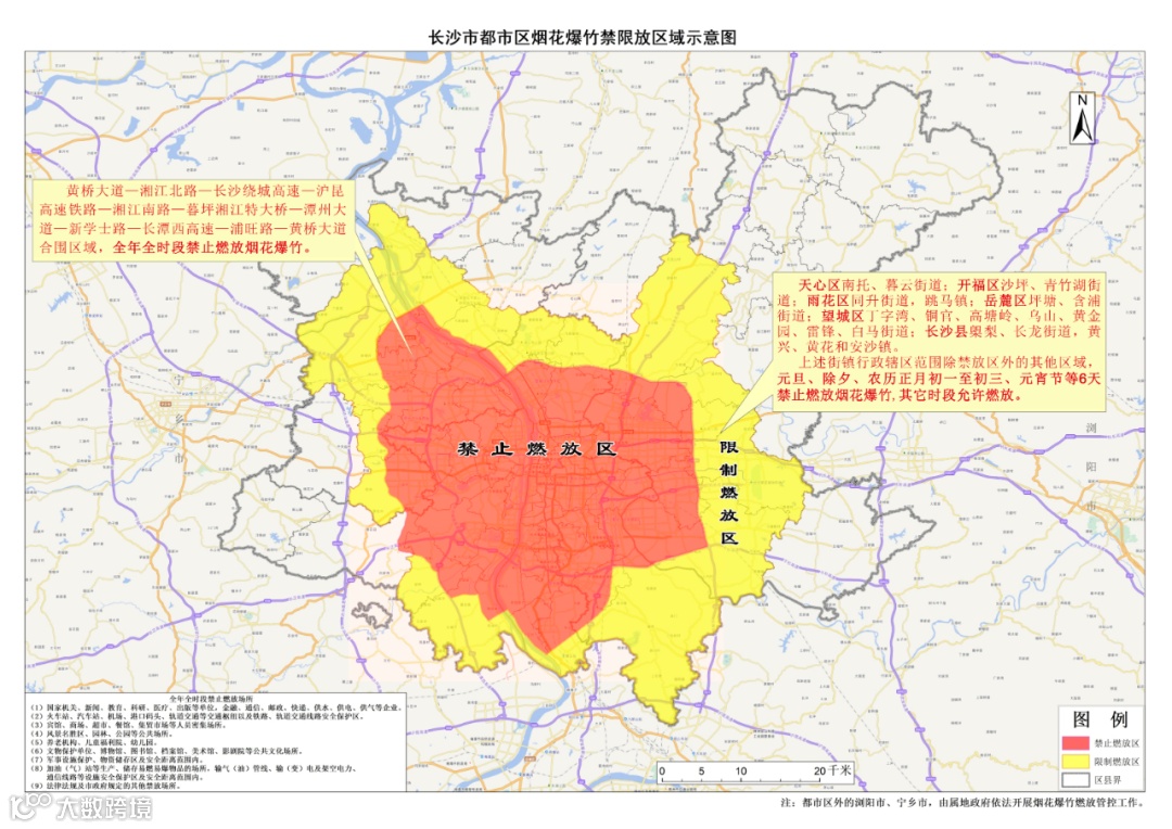 (一)天心区南托街道、暮云街道,开福区沙坪街道、青竹湖街道,雨花区同升街道、跳马镇,岳麓区坪塘街道、含浦街道,望城区丁字湾街道、铜官街道、高塘岭街道、乌山街道、黄金园街道、雷锋街道、白马街道,长沙县㮾梨街道、长龙街道、黄兴镇、黄花镇和安沙镇,上述街镇行政辖区范围除禁止燃放区域外,均为限制燃放烟花爆竹区域。