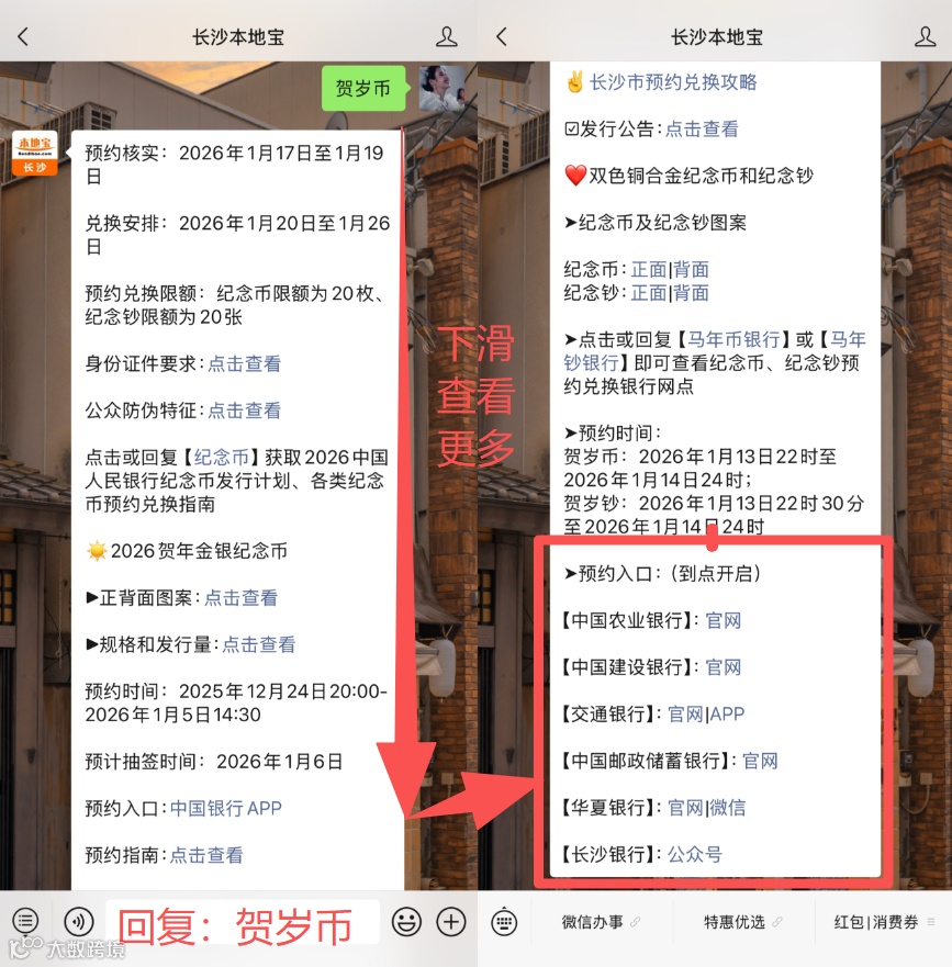 或扫描下方二维码,关注【长沙本地宝】,后台对话框私信回复关键词【贺岁币】,获取2026马年贺岁纪念币-长沙银行、中国农业银行、中国建设银行、交通银行等各官方预约兑换入口,到点开放! 点击直达入口!
