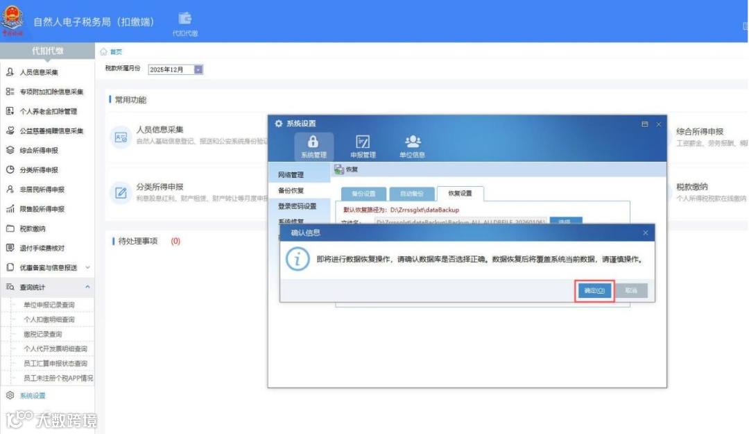 3.系统弹出确认信息,点击【确定】,完成数据恢复。