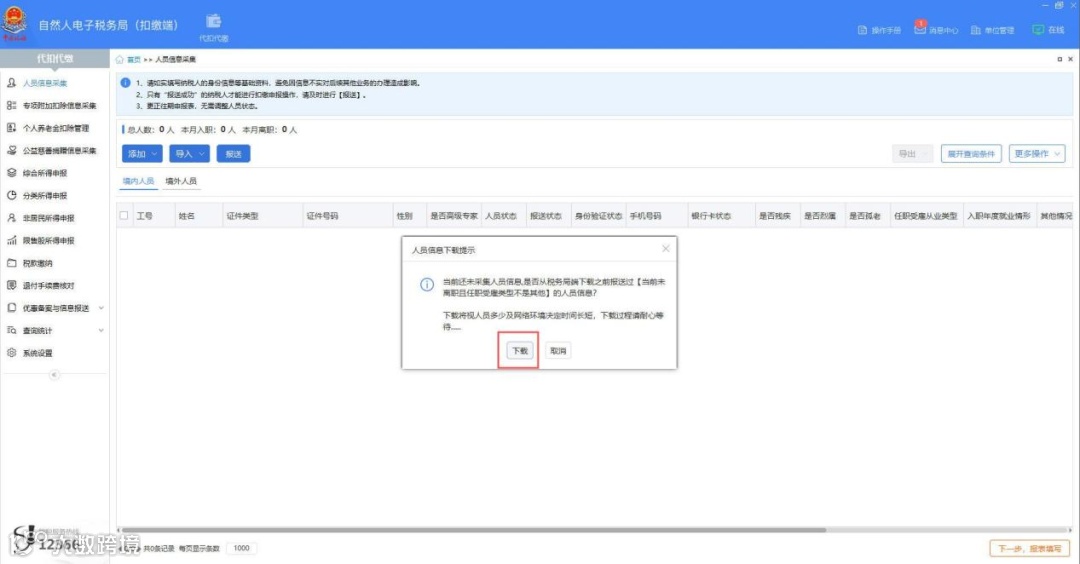 3.系统弹出提示:“当前还未采集人员信息,是否从税务局端下载之前报送过【当前未离职且任职受雇类型不是其他】的人员信息?”点击【下载】。
