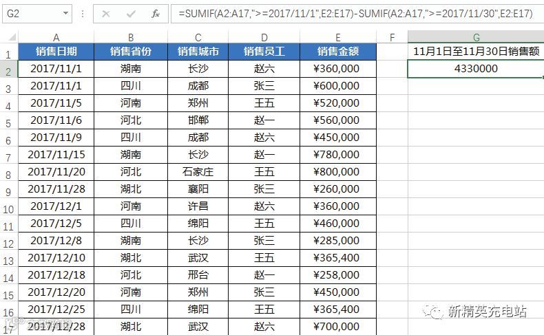 打开“销售统计表.xlsx”文件,在G1单元格中输入“11月1日至11月30日销售额”,在单元格G2中输入公式“=SUMIF(A2: A17,">=2017/11/1",E2:E17)-SUMIF(A2:A17,">= 2017/11/30",E2:E17)”,按“Enter”键,即可得到该时间段内的销售总额,如下图所示。该公式的含义为11月1日至11月30日的销售额等于11月1日以上的销售额减去11月30日以后的销售额。