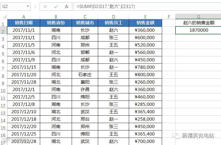 打开“素材文件\第3章\销售统计表.xlsx”文件,在G1单元格中输入“赵六的销售金额”,在单元格G2中输入公式“=SUMIF(D2:D17,"赵六",E2:E17)”,按“Enter”键,即可得到赵六的销售金额值,如下图所示。