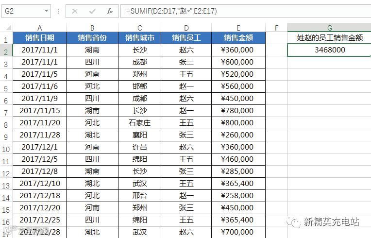 打开“销售统计表.xlsx”文件,在G1单元格中输入“姓赵的员工销售金额”,在单元格G2中输入公式“=SUMIF(D2: D17,"赵*",E2:E17)”,按“Enter”键,即可得到姓赵员工的销售金额值,如下图所示。