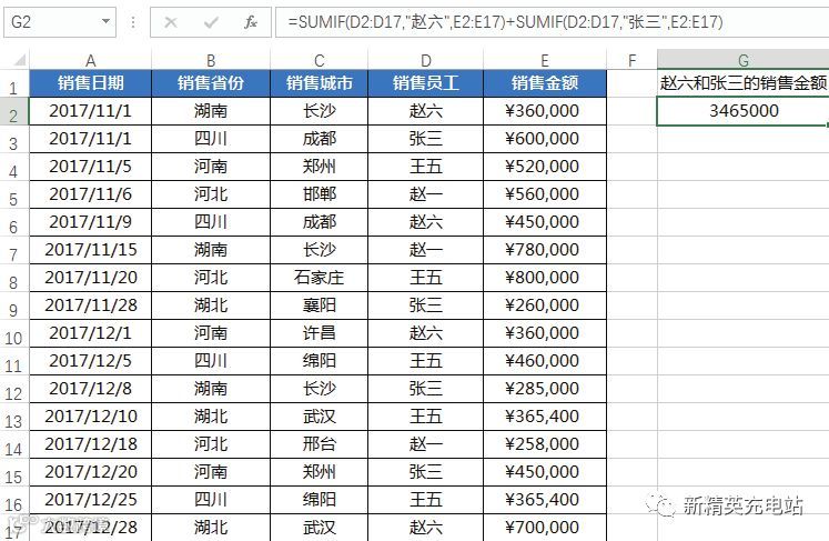 打开“销售统计表.xlsx”文件,在G1单元格中输入“赵六和张三的销售金额”,在单元格G2中输入公式“=SUMIF (D2:D17,"赵六",E2:E17)+SUMIF(D2:D17,"张三",E2:E17)”,按“Enter”键,即可得到赵六和张三的销售金额总计值,如下图所示。