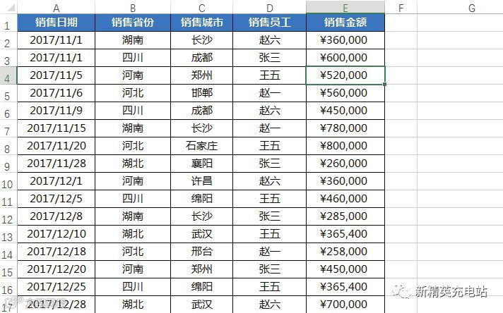 下图所示为各个销售员工在各个销售日期的不同销售省份和销售城市的销售金额表格,现要在该表格中获取以下4个数据。