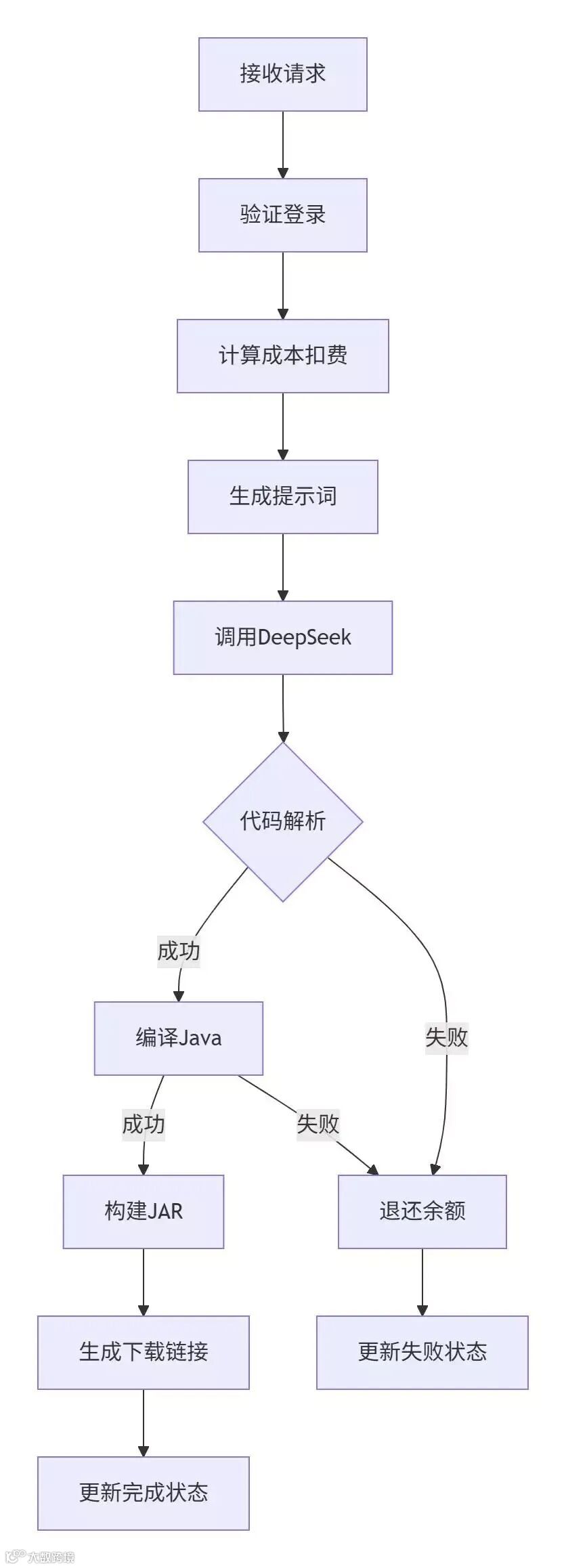 平台对接DeepSeek大模型,用户提交插件需求后,AI自动生成Nukkit插件并提供下载。整个流程实现从需求描述到插件构建的一站式服务。
