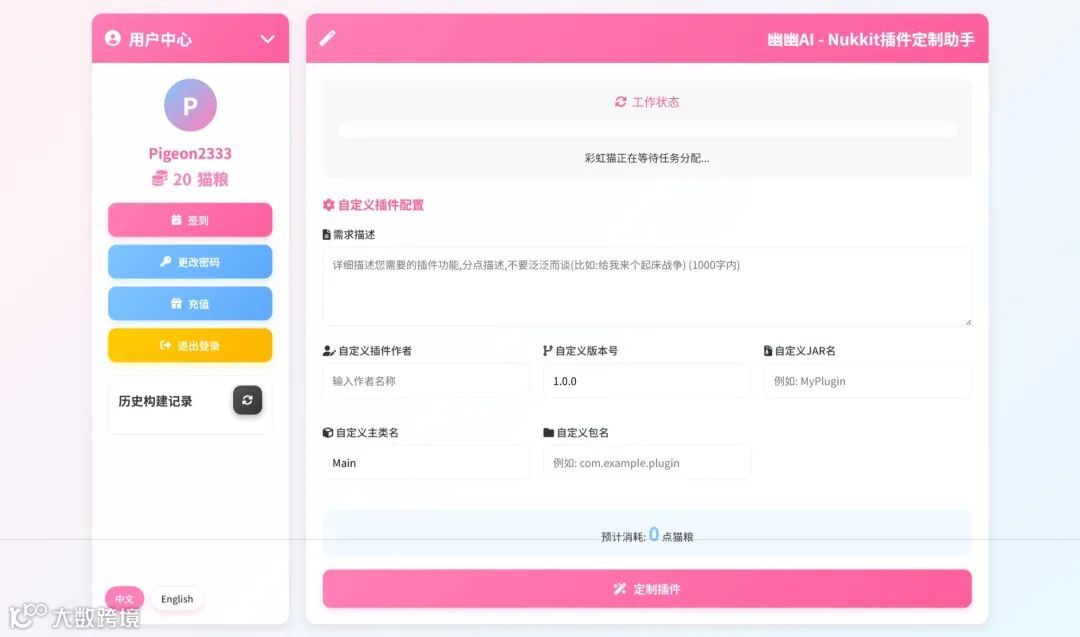 注册或登录官网后,每日签到可领取“猫粮”(用于插件生成的消耗点数)。在需求描述栏中清晰、分点列出所需功能,避免笼统表述(如“做个起床战争”),总字数控制在1000字以内。