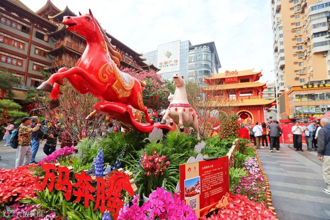 教育路口“神驹献瑞”小景,以“中华第一青铜马”为主体设计原型,寓意福泽临门、表达新年祝福。各景观共同讲述新时代“老城市新活力”的故事,呈现“广州过年 花城看花”新内涵。
