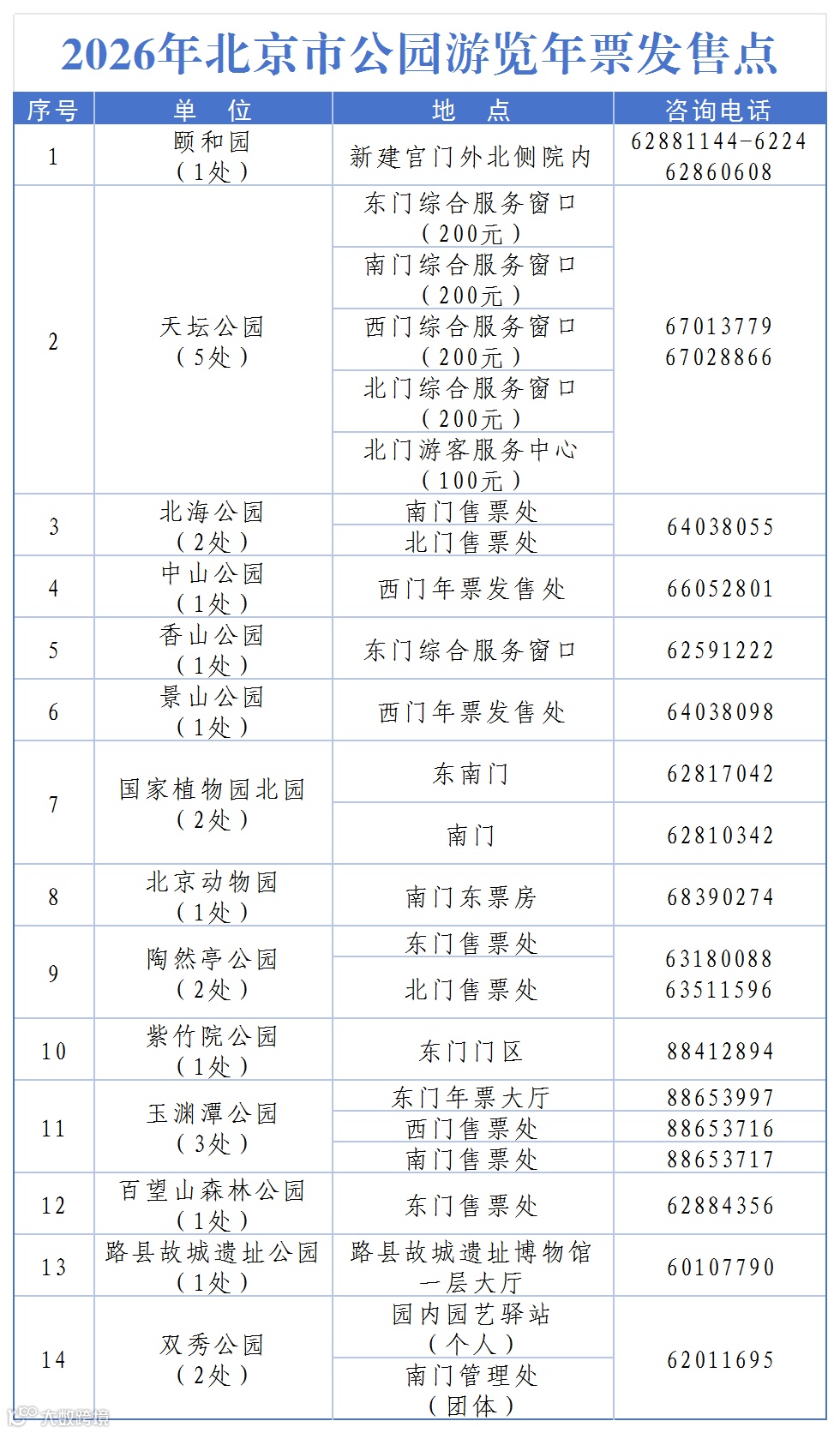 注:景山公园西门、陶然亭公园东门、玉渊潭公园东门、中山公园西门4处为2026年北京市公园游览年票线下常设发售点,2026年1月16日至2026年10月20日每日8:30至16:30仍可办理。