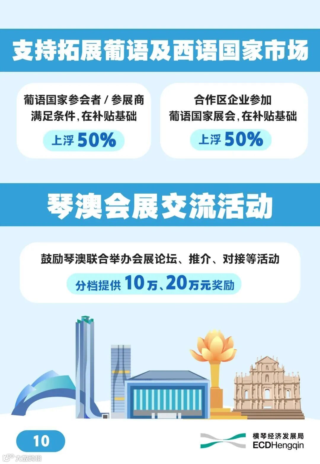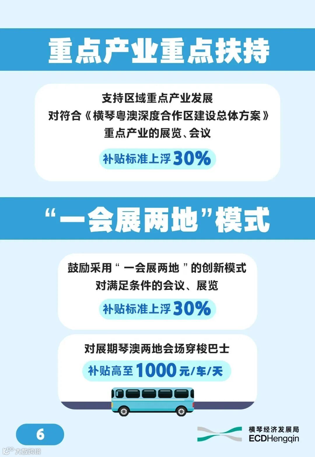 👉為降低企業辦展成本,《扶持辦法》還對“一會展兩地”項目往來琴澳場地間的交通費用給予補貼。對參會參展代表葡語及西語國家代表佔比超過10%的項目,也設有相應激勵措施。