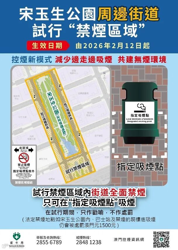 💁♀️特區政府貫徹落實《健康澳門藍圖》中降低煙草使用率的目標,以立法、執法、教育宣傳及鼓勵戒煙等多管齊下策略執行各項控煙政策和措施。為保障行人健康,減少邊走邊吸煙的行為,將於宋玉生公園四周的街道及空地試行“禁煙區域”。市政署於2月6日起在該區域開展“禁煙區域”和“指定吸煙點”繪製地面界線及標記工作,待相關工作完成後將於2月12日起正式試行。