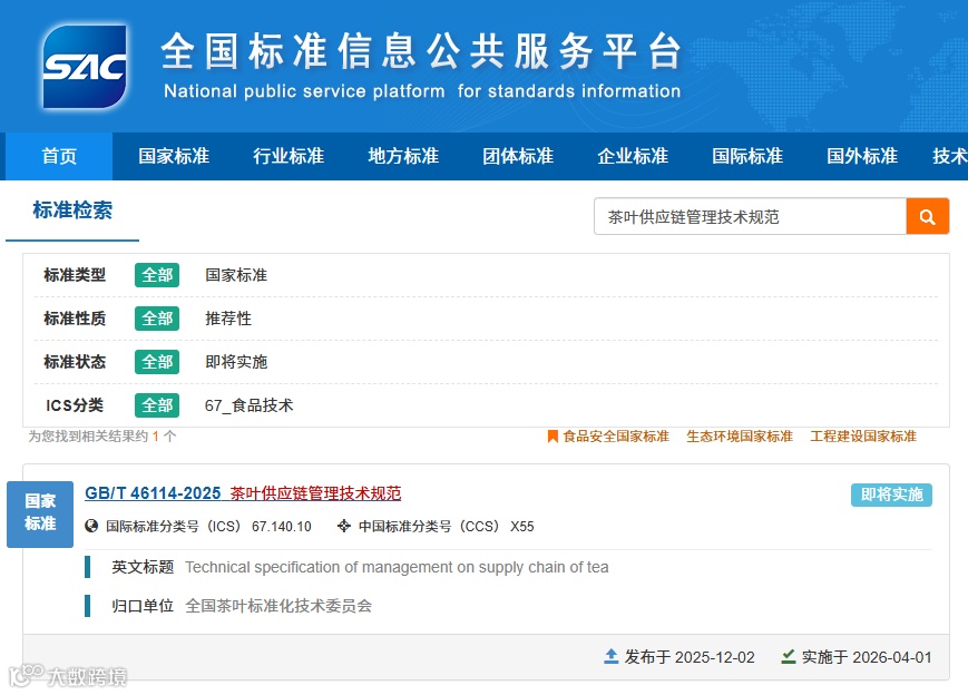 日前,国家市场监督管理总局(国家标准化管理委员会)正式发布《茶叶供应链管理技术规范》国家标准(标准号:GB/T 46114-2025),该标准将于2026年4月1日实施。