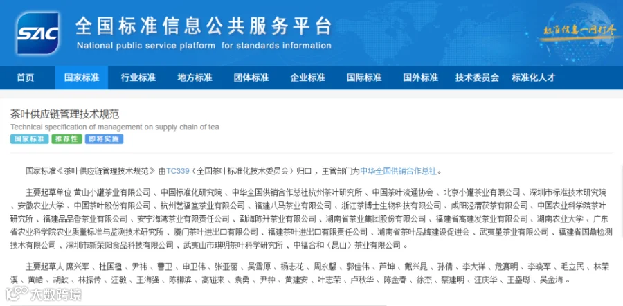 该标准是我国茶叶供应链领域的首项国家标准,其发布标志着中国茶产业在供应链标准化、体系化建设方面取得突破性进展。标准规定了茶叶供应链管理的总则、供应商选择与管理、采购、加工、包装、仓储、运输配送、销售等技术规范。