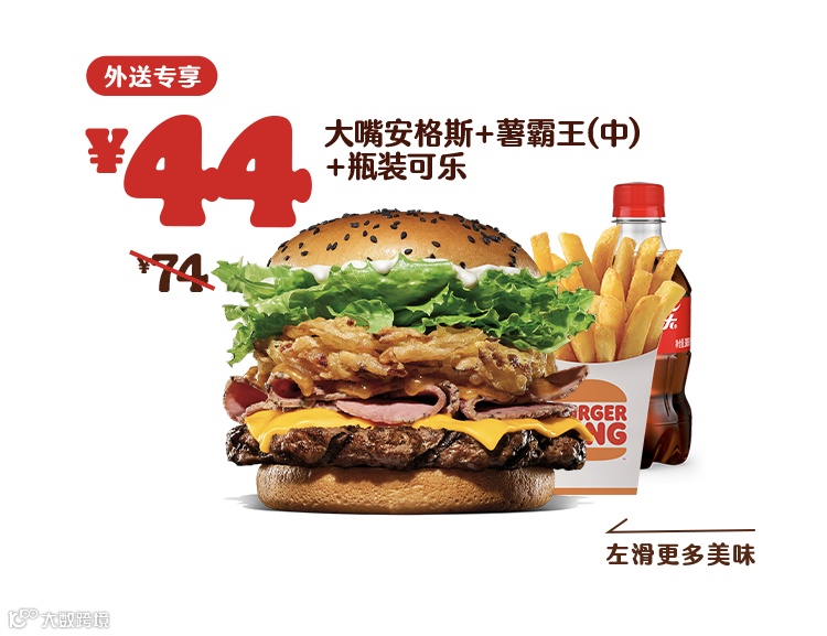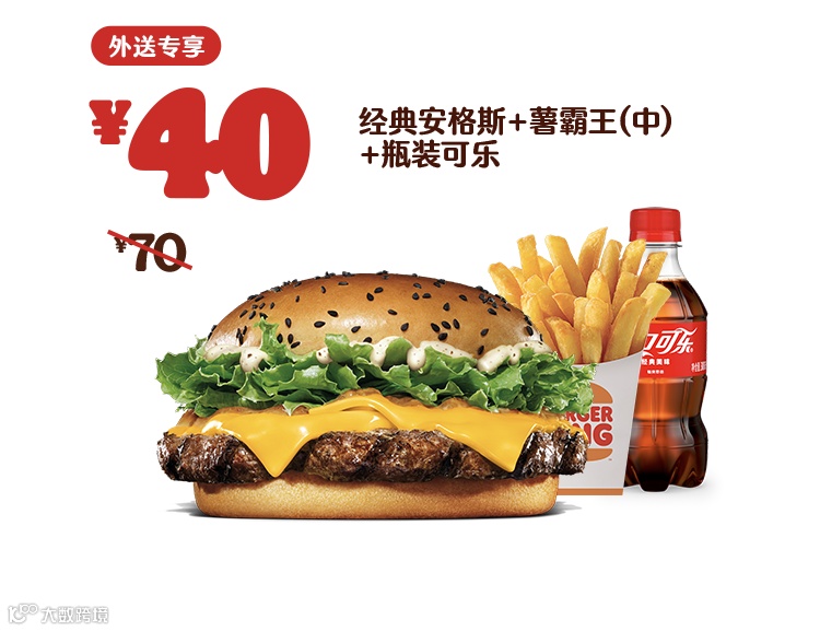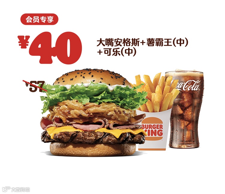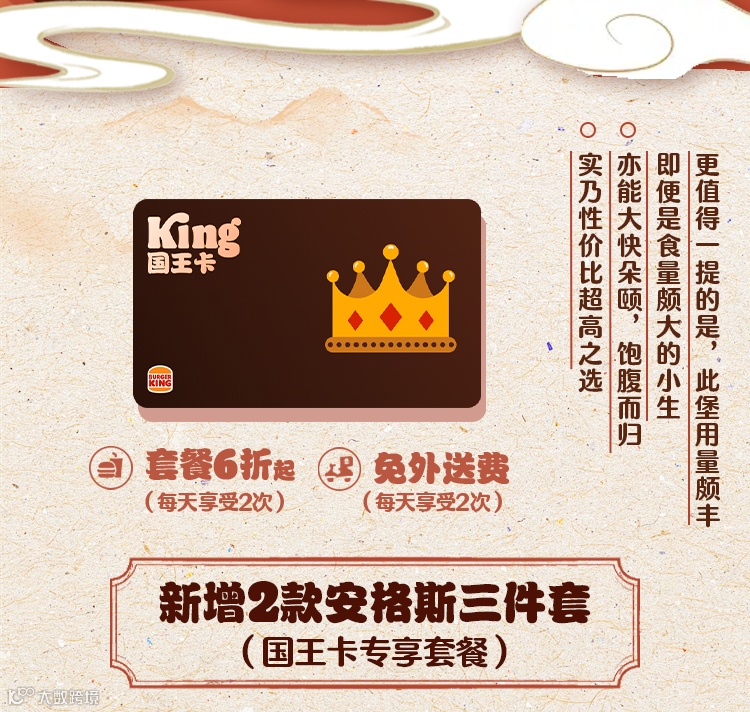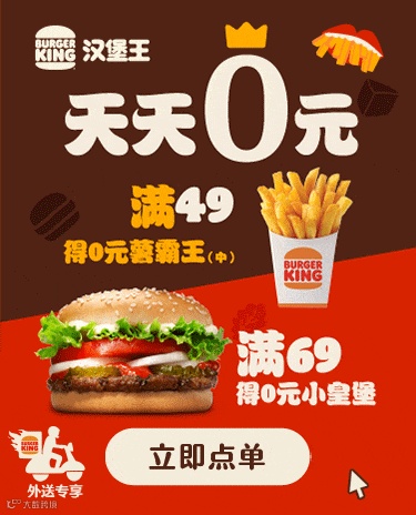 *外卖渠道价格解释:图示如有划线价格,并非指原价,而是指不参加优惠活动情况下该产品在汉堡王外送销售的常规价格(或者指其中所含单品的常规单买价总和)或汉堡王外送建议零售价。除非图示另有解释,否则图示如有节省的金额或折扣比例,是与不参加优惠活动情况下在汉堡王外送单独购买该产品的常规价格(或者其中所含单品的常规单买价总和)或汉堡王外送建议零售价相比较。