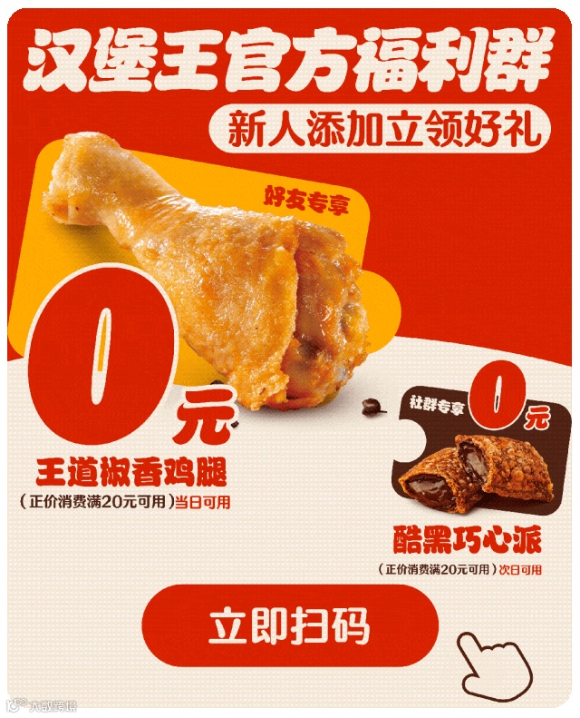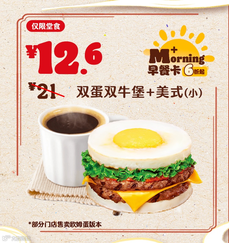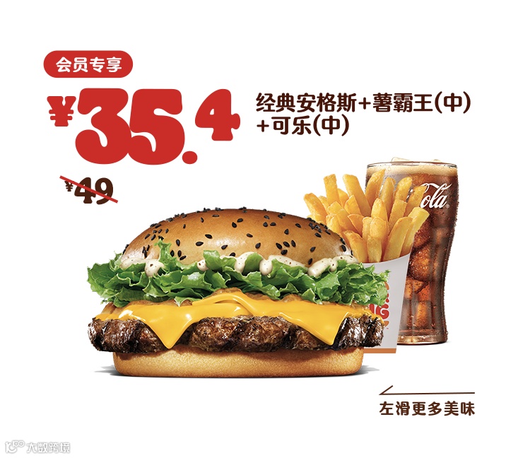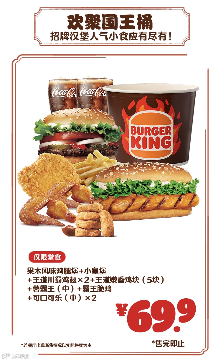 *非外卖渠道价格解释:图示如有划线价格,并非指原价,而是指不参加优惠活动情况下该产品在汉堡王指定门店销售的常规价格(或者指其中所含单品的常规单买价总和)或汉堡王门店建议零售价。除非图示另有解释,否则图示如有节省的金额或折扣比例,是与不参加优惠活动情况下在汉堡王指定门店单独购买该产品的常规价格(或者其中所含单品的常规单买价总和)或汉堡王门店建议零售价相比较。若需要查询当前门店销售的常规价格,可查看相应门店菜单或详询店员。