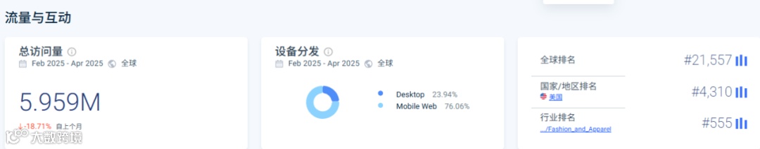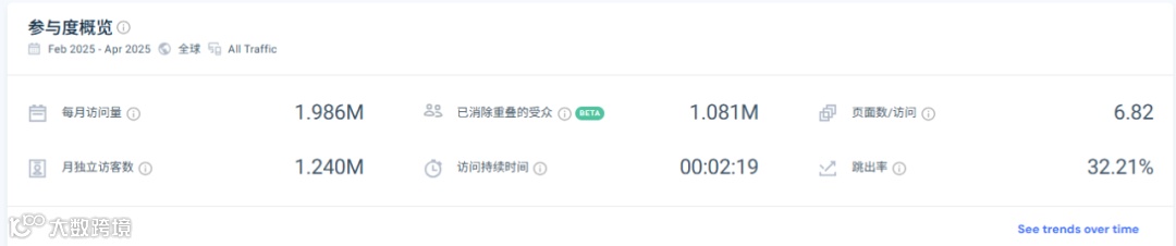 2025年2月——4月,该网站总访问量达到595.9万次,此外,网站的跳出率仅为32.21%,显示出良好的用户粘性。