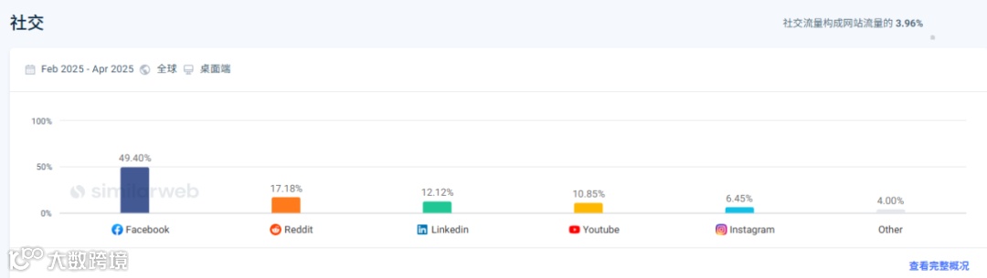 社交流量占总流量的15.64%,其中Facebook占据了近一半的社交流量,说明该网站在社交媒体上具有较强的影响力和用户互动能力。