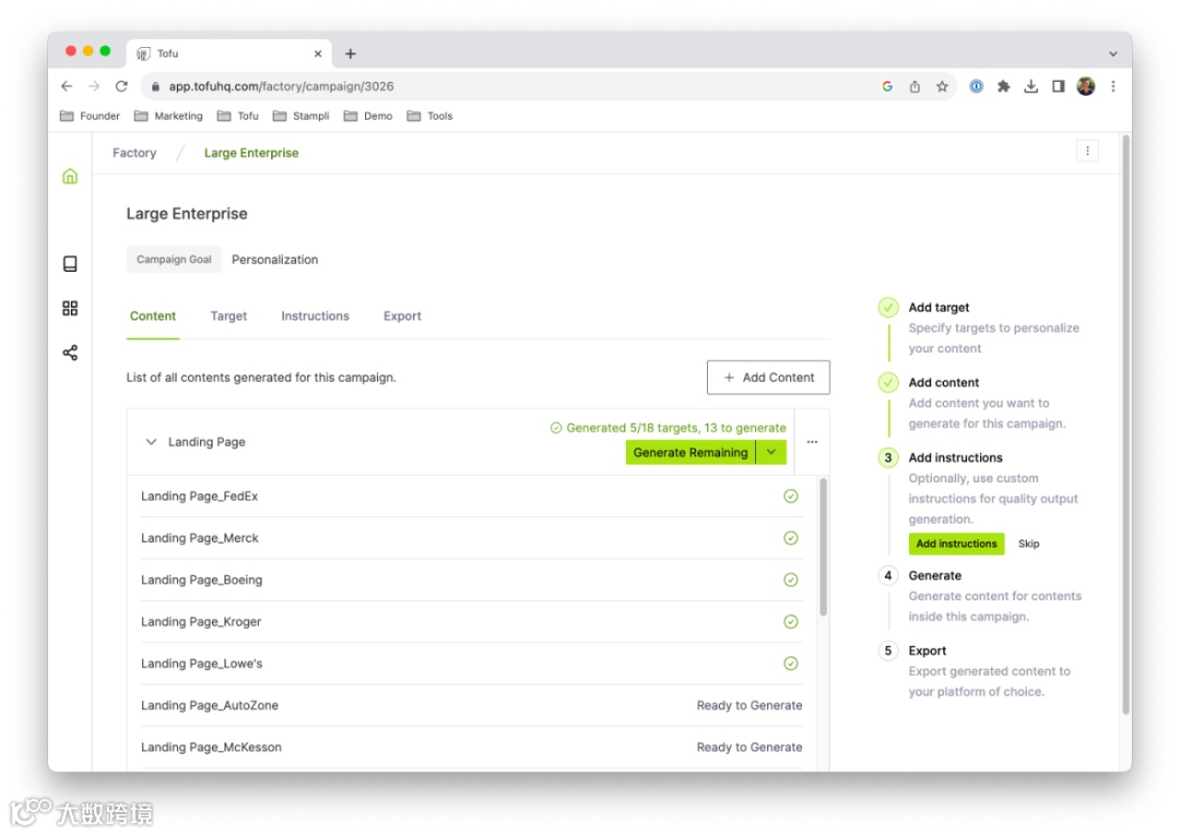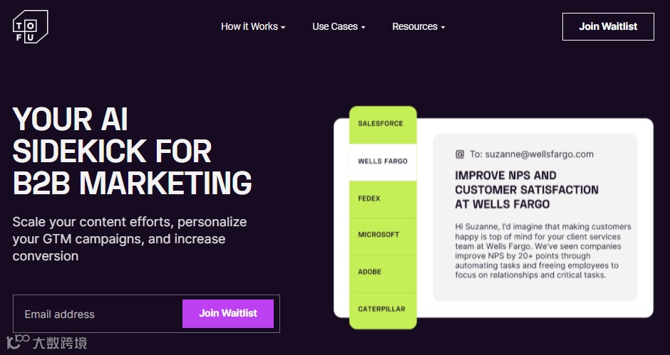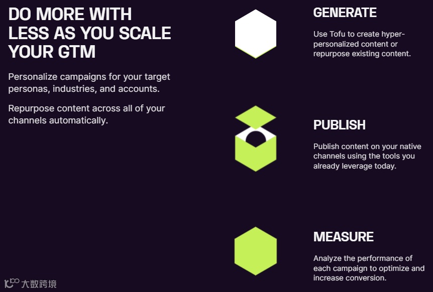 Tofu 是一个用于大规模创建超个性化、全渠道营销活动的生成式人工智能平台,能够大量生成特定于受众的品牌登录页面、博客文章、白皮书、电子邮件、案例研究等营销材料。测试客户的实践显示, Tofu 为客户提效超过 200% 。