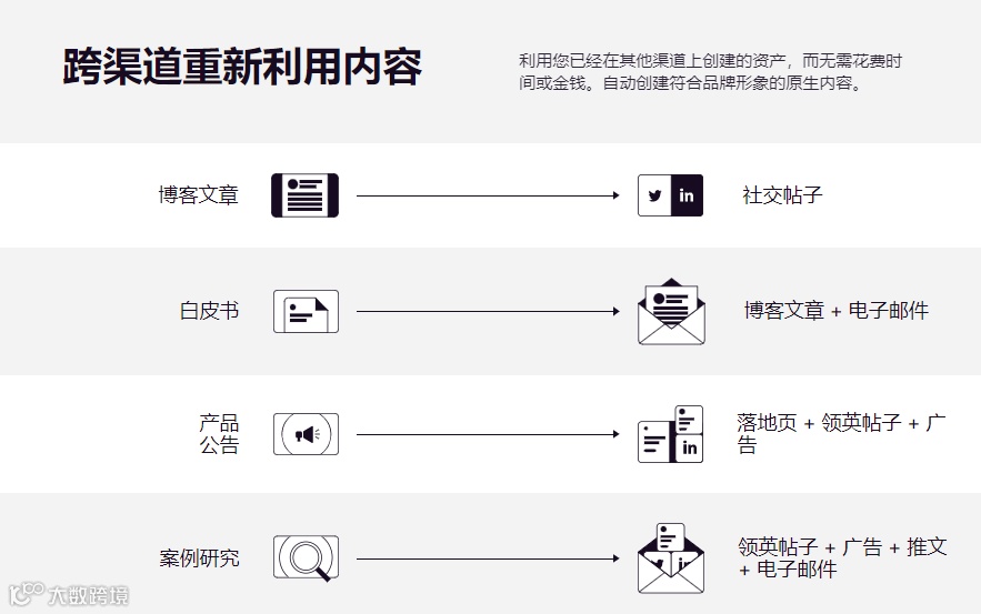 将白皮书、案例研究、产品公告或其他核心资产自动转化为全面的全渠道营销活动。您的品牌和信息传达,无需任何手动操作或高昂费用。