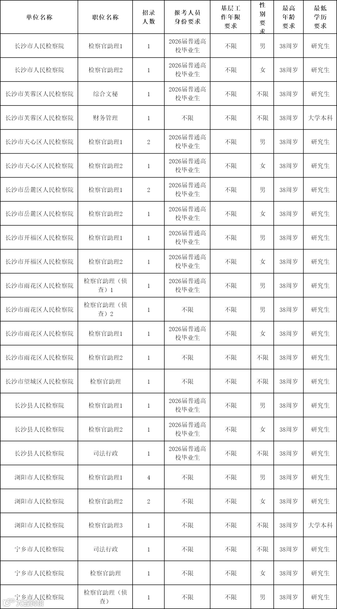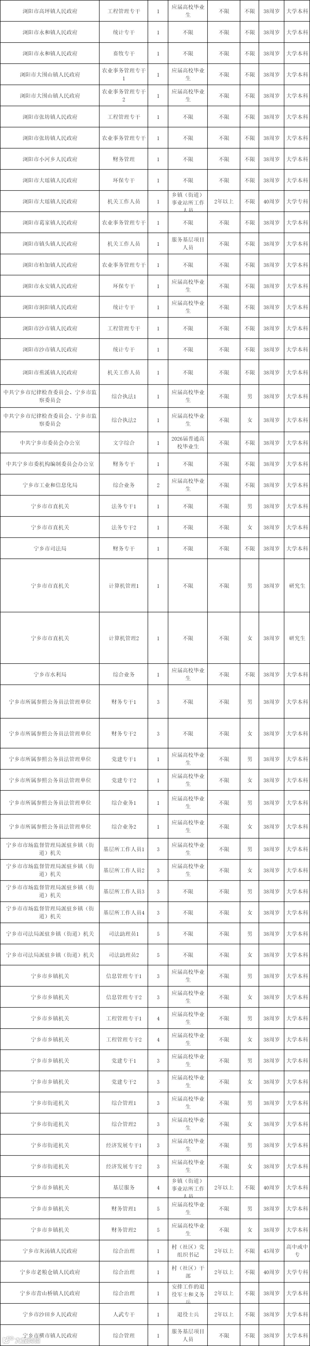 2026湖南省考长沙考区岗位表