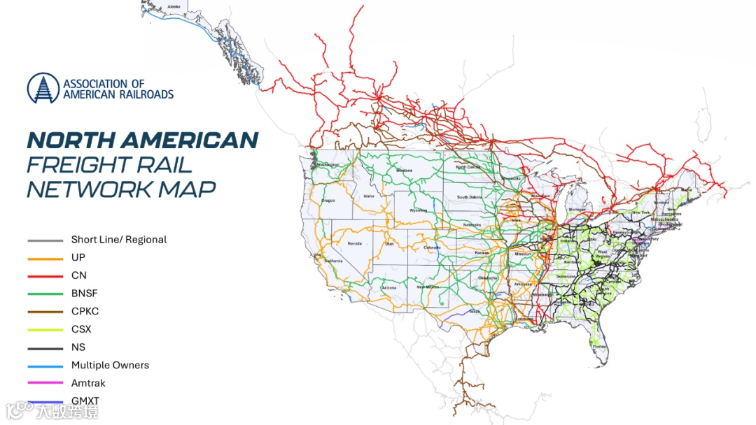 北美货运铁路历经多年整合,已形成六大一级运营商格局。其中四家美国本土企业呈现“东西分踞”态势:西部由UP和BNSF主导,东部则由NS和CSX占据主要份额。这一结构导致货主在特定区域通常仅有两家运营商可选,市场竞争有限。