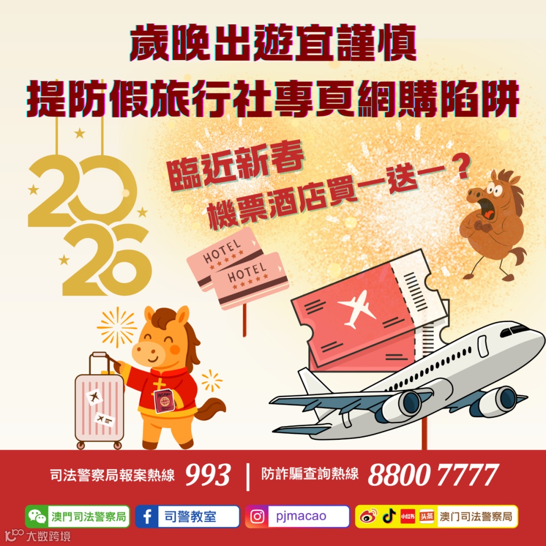 👉司法警察局近期發現,有不法分子透過互聯網社交平台假冒旅行社開設專頁,刊登虛假的旅遊產品廣告,並聲稱提供“買一送一”等超值機票優惠,或以“限時優惠”及“折扣促銷”等手法,誘騙市民購買不存在的旅遊產品。事主一旦支付訂金或全額費用,騙徒隨即將其列入黑名單並失去聯絡,至此事主始發現受騙。