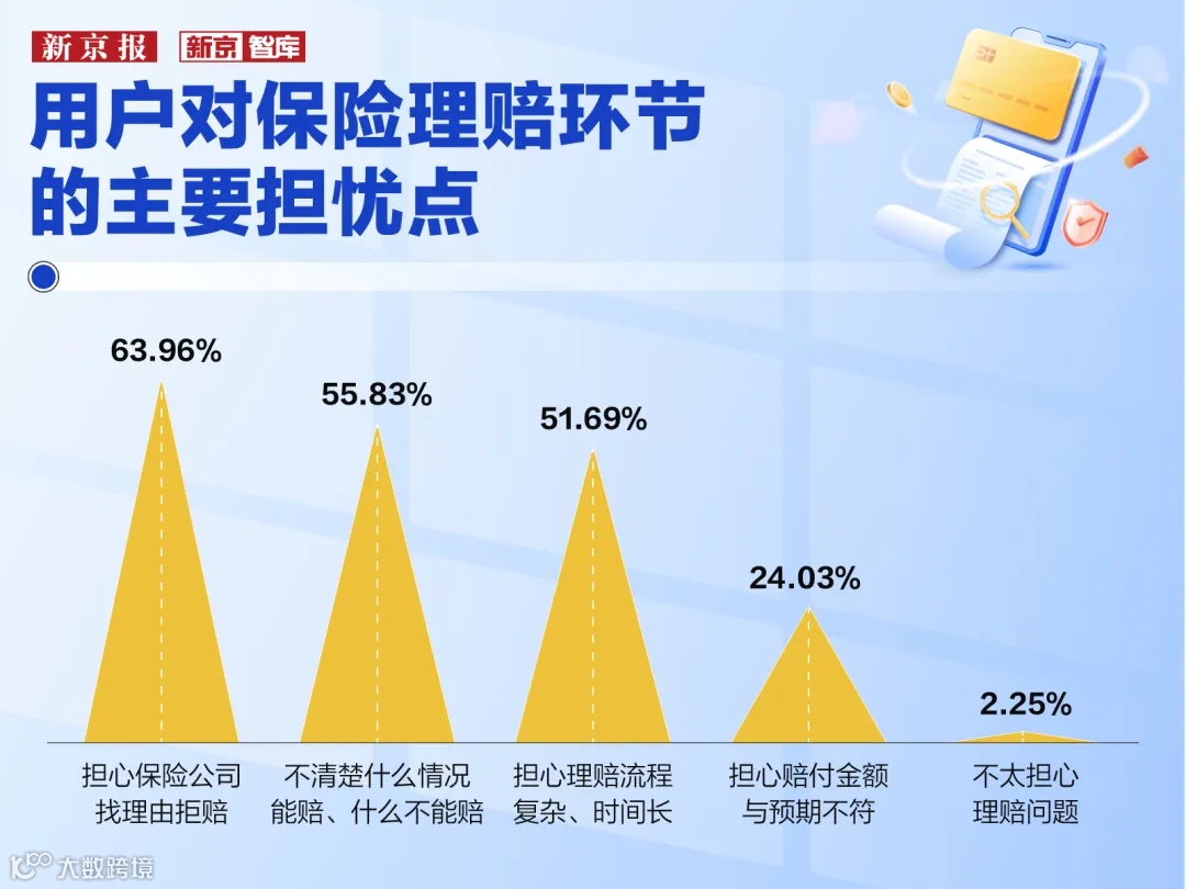 其中,有63.96%的用户担心保险公司“找理由拒赔”,55.83%的用户“不清楚什么情况能赔、什么情况不能赔”。