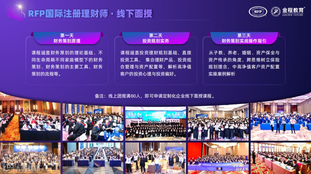 线上团报满80人,可申请定制化企业线下面授课程。三天即可学完财务策划原理、投资规划实务、财务策划实战操作指引课程。