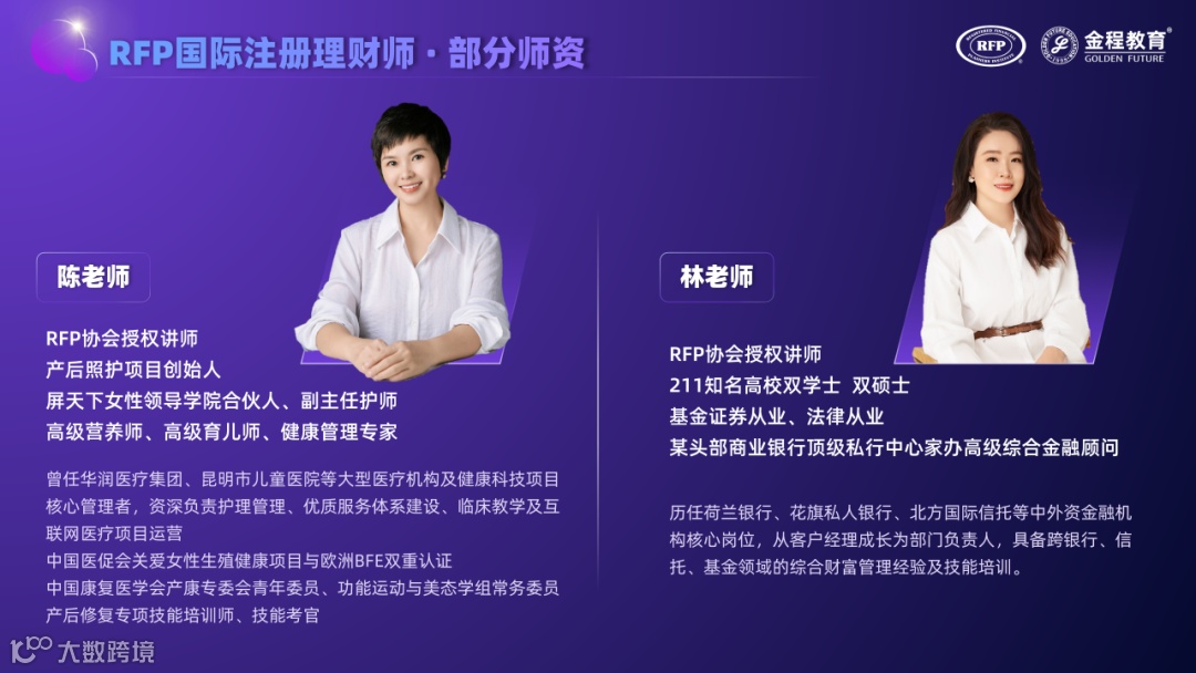 RFP国际注册理财师的师资团队平均从业经验超15年,理论知识扎实,实战经验丰富,覆盖保险、银行、证券、信托、第三方财富管理等全领域。