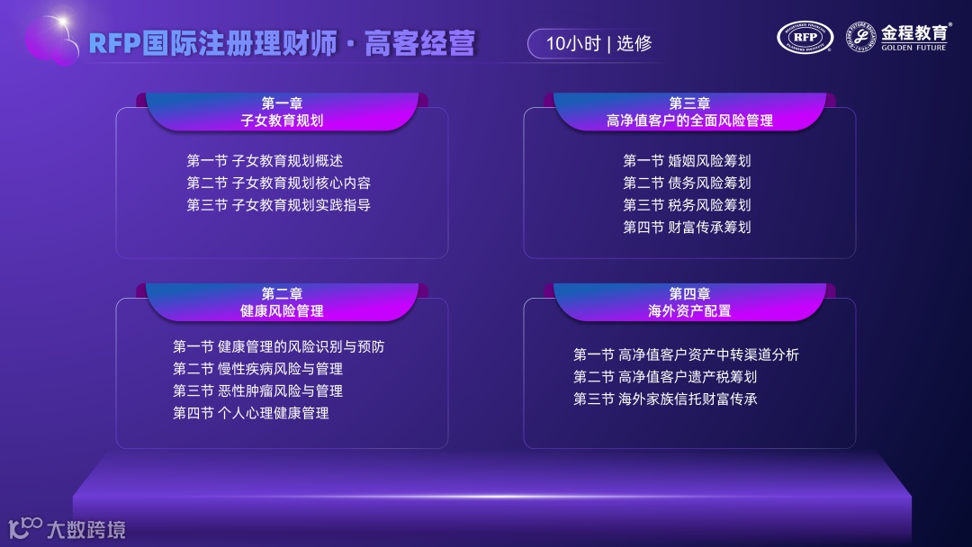 第三阶段,则是课程的“进阶阶段”。从子女教育规划、健康风险管理、高净值客户的全面风险管理、海外资产配置四个方面,有针对性地提升专项服务能力。