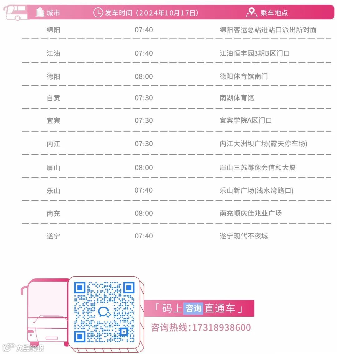 特别提醒:请确认已成功预订座位后再行前往乘车地点;准点发车,过时不候,请按时等候;具体乘车点位可添加小助手获取。