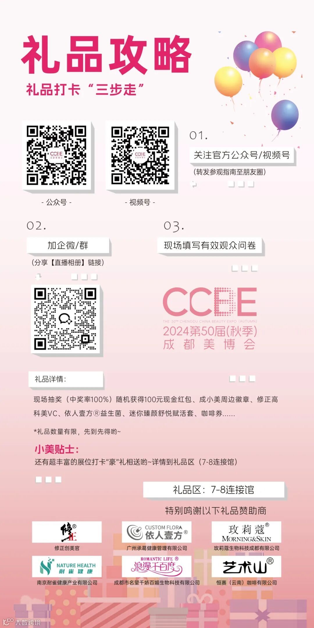 福利加码,百元现金红包、成小美定制徽章、修正高科美VC、依人壹方®益生菌、迷你臻颜舒悦赋活套、咖啡券、礼品盲盒......丰富好礼等您现场解锁!