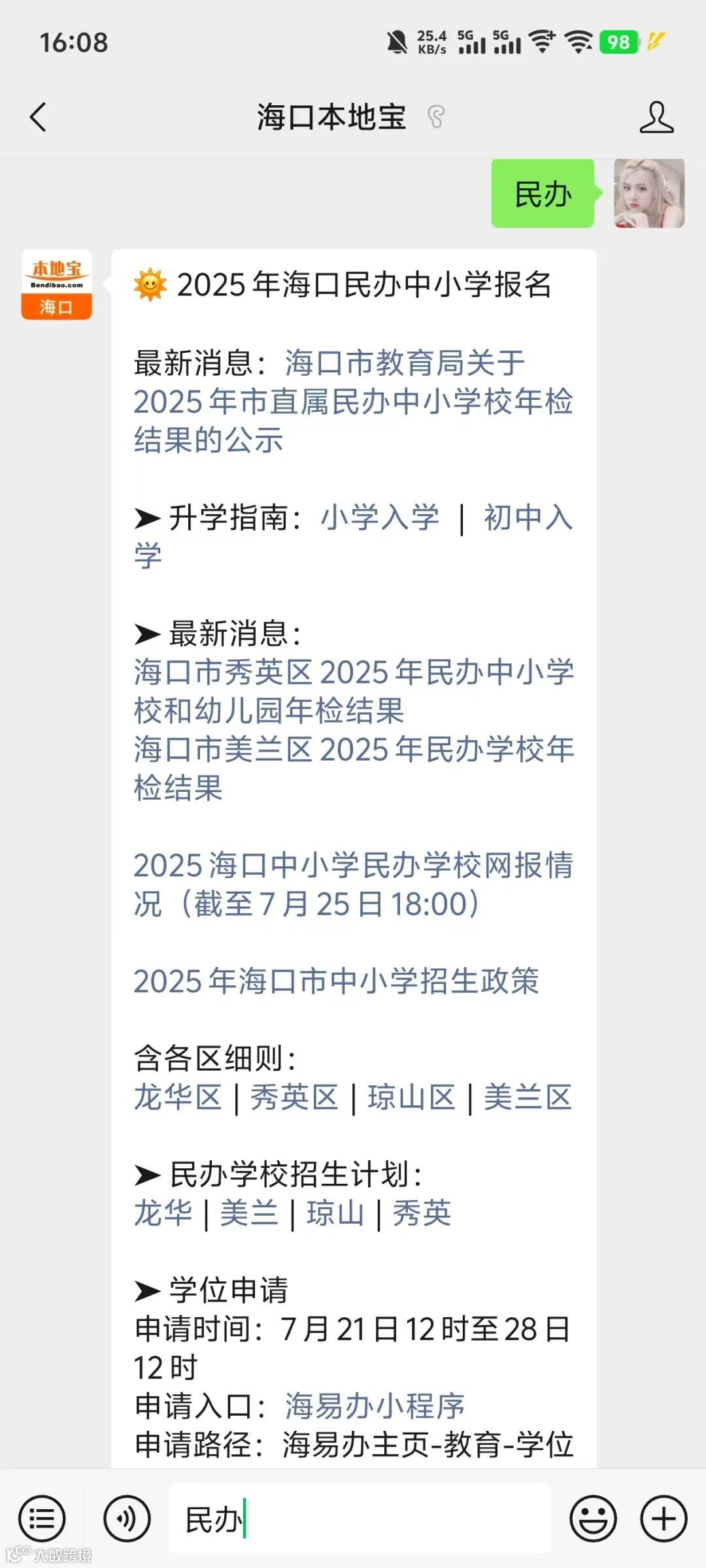 可以长按识别下方二维码,关注【海口本地宝】公众号,关注后在对话框回复【民办】即可获取海口中小学民办学校名单,查看往年各学校招生计划、招生政策、申请指南等相关信息。