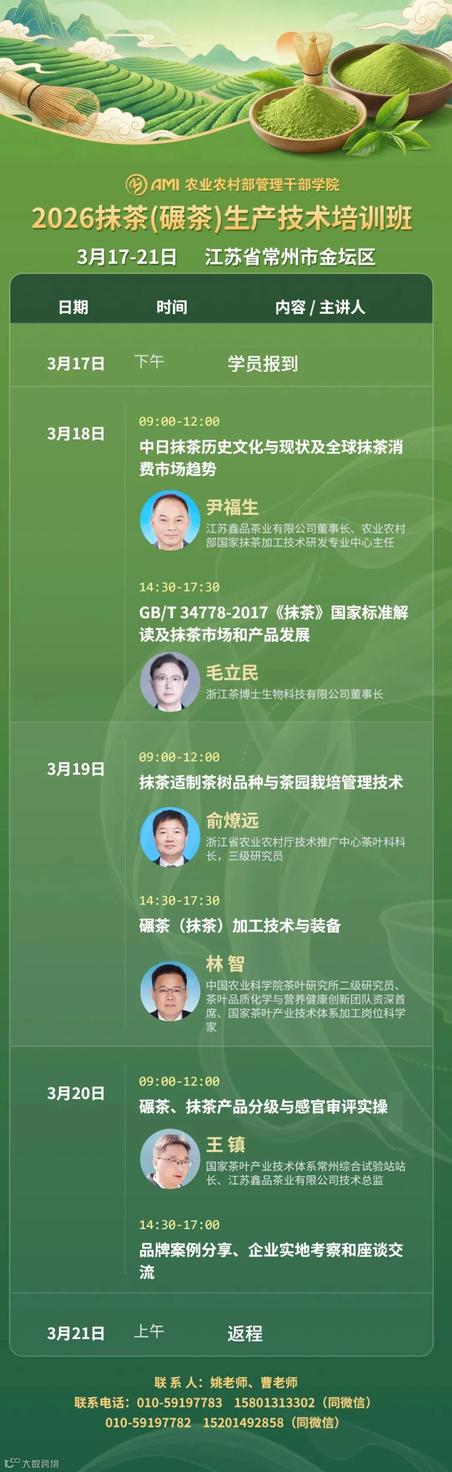 在抹茶产业高质量发展的重要时期,为持续提升中国抹茶生产技术水平、培育专业人才队伍,夯实产业发展根基,农业农村部管理干部学院将于2026年3月17—21日在江苏省常州市金坛区举办2026年抹茶(碾茶)生产技术培训班。从历史文化到国家标准,从全球消费趋势到核心加工技术,深度解析产业发展路径。