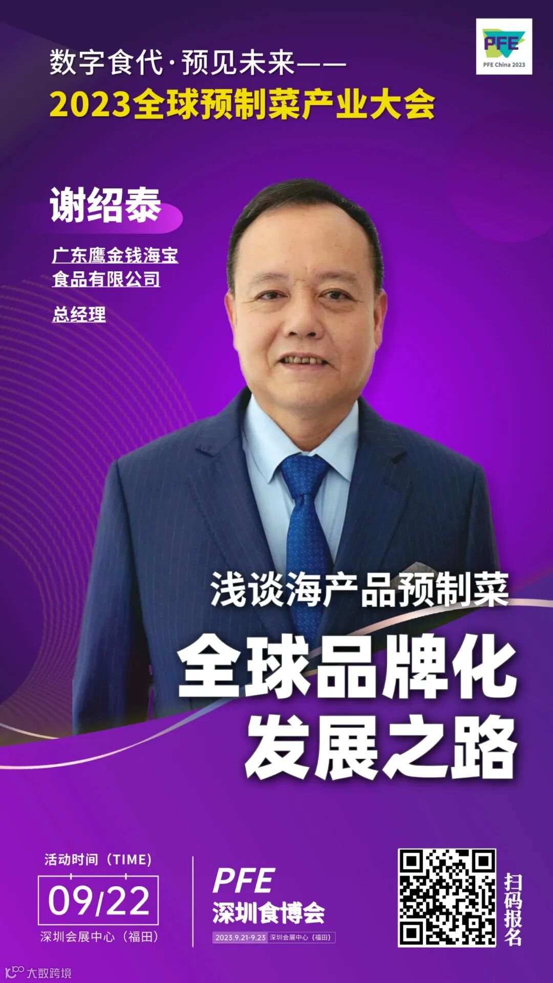 广东鹰金钱海宝食品有限公司总经理 谢绍泰 已确认参加2023年9月22日 “数字食代·预见未来”——2023全球预制菜产业大会,将以《浅谈海产品预制菜全球品牌化发展之路》为题带来精彩分享。