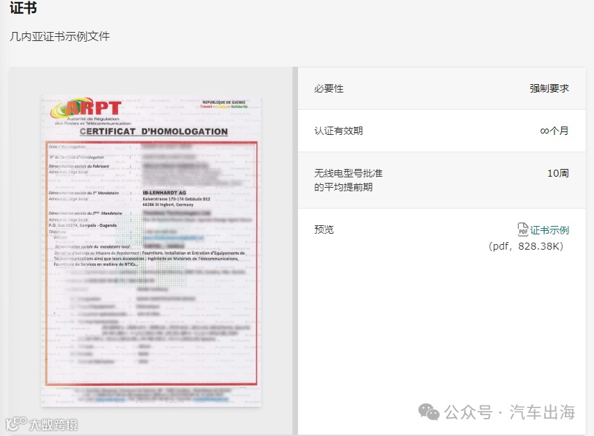 汽车出海几内亚的型式认证程序由邮政和电信监管局(ARPT)主导,认证标准与欧盟一致,主要依据欧盟指令2014/53/EU进行合规性审核。申请过程中无需在本地实验室测试,也无需联系当地代表,但需提交产品样品供审查。
