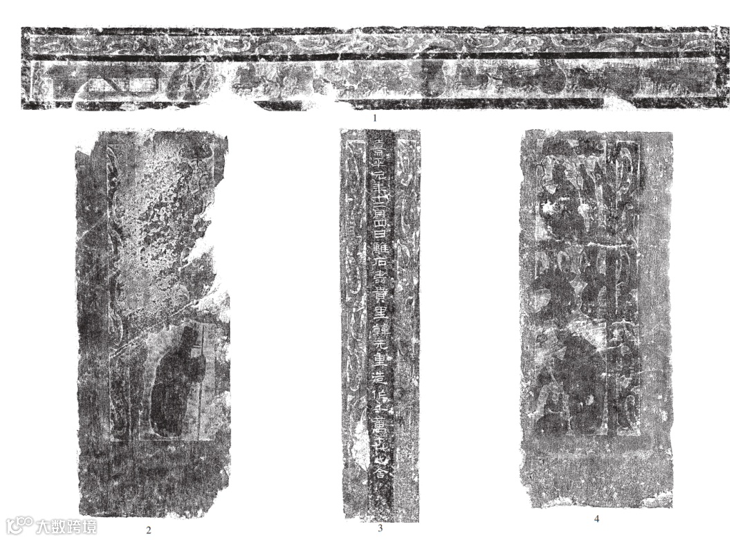 本次征集的1~4号画像石,从形制和尺寸上看,应该分别是用于前室某个壁面上的横额石、左右立柱石和石柱。其中1号石双面均有画像,尤为特殊。1997年离石石盘村画像石墓中出土的6号石也属此类,其被安放在墓葬前室南壁靠近甬道处。该石内侧满绘车马出行图,外侧的左右两端因被砖砌壁面遮挡,仅在中部约三分之一的石面上刻绘出二车一骑。1号石的使用方式应与之近同,但其外侧有画像的部分所占比例更大,且有与其相配的4号石柱,推测该组画像石用于前室非靠近甬道的某个壁面上。