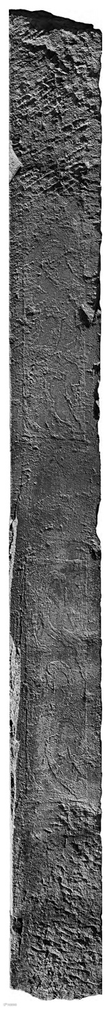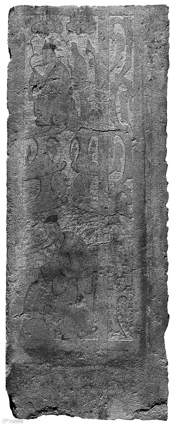 横292、纵33、厚23厘米,双面均有画像。正面分上下两栏,上栏较窄,刻绘云气纹。下栏主题为车马出行。最前方为一座单层建筑,悬山顶,墨线绘出瓦脊,三开间,中间位置有一斜梯。建筑两旁植树,右侧一吏持物向右躬身迎接车马队伍,车马向左行进,从左至右依次为导骑3名、轺车1乘、导骑1名、轺车1乘、輂车1乘、牛车1乘(图一、二:1)。背面画像部分长约174厘米,分左右两格,保存较差,刻云气纹,画面外两端保留有平整石面的凿纹(图三)。