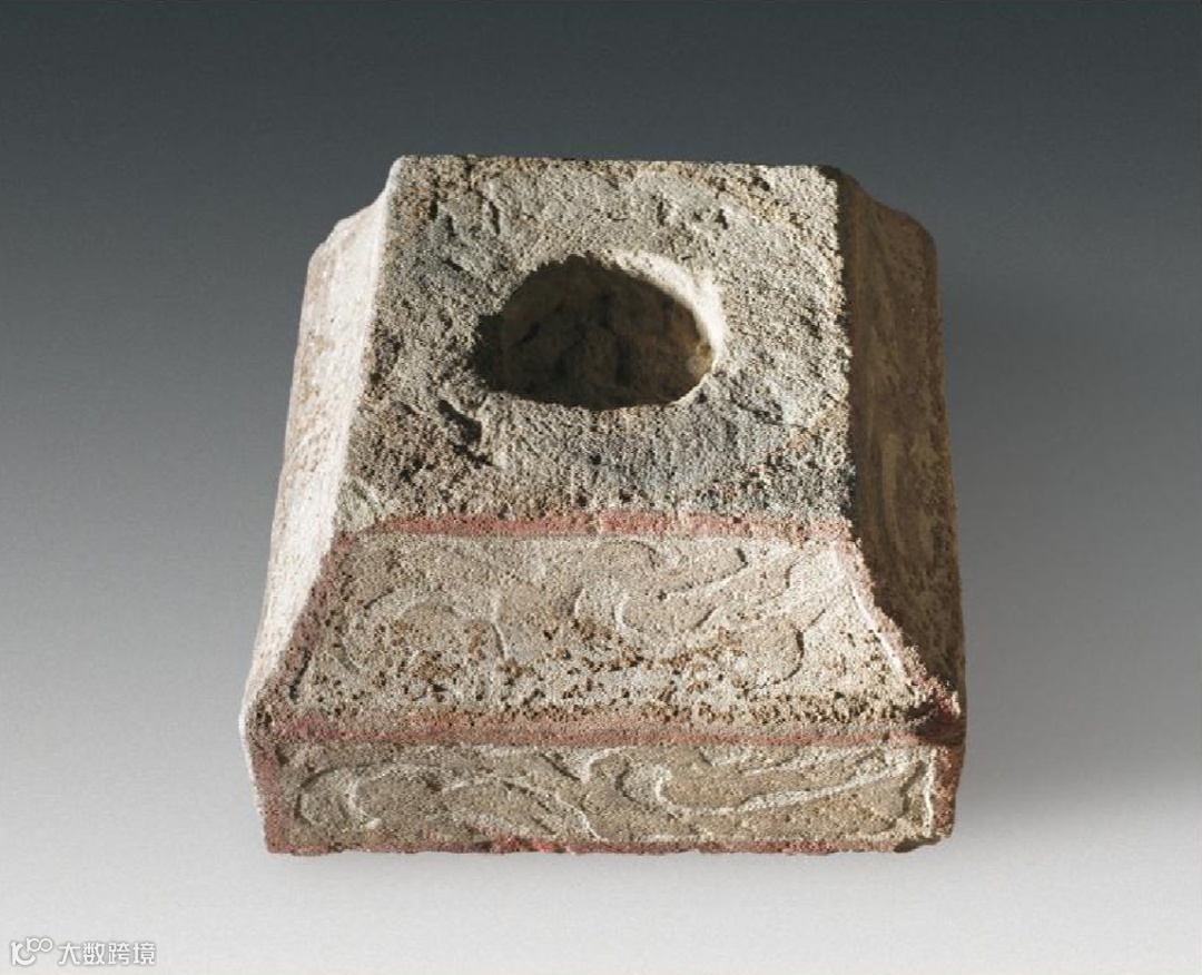 4号画像石 石柱,高116厘米,横断面呈六边形,边长9.2厘米。正面阴刻汉隶“熹平元年十二月四日离石寿贵里韩元重造作千万卋(世)之舍”(图六、二:3),其余五面刻绘卷云纹(图七)。石柱顶端凸起一圆形榫头,以榫卯形式与上方的方形栌斗石相接。栌斗石高16厘米,八面均刻绘卷云纹,每面以朱彩描绘边界(图八)。