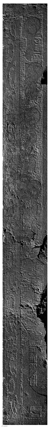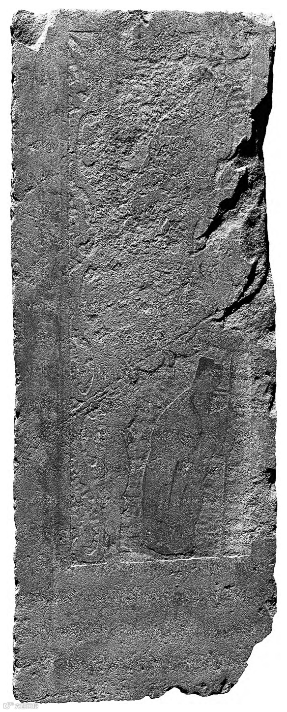 3号画像石 横53、纵132、厚21厘米,分左右两栏构图。右栏刻绘卷云纹,左栏上部为东王公,下部为门吏。东王公头戴冠,唇留长须,身着右衽宽袖长袍,手持仙草,面向左侧,跽坐于双层亚腰形云柱之上,其后有一侍从手举曲柄华盖,立于云柱之上。门吏头戴黑帻,身着右衽长袍,腰间佩剑,面左拥盾躬身站立(图五、二:4)。