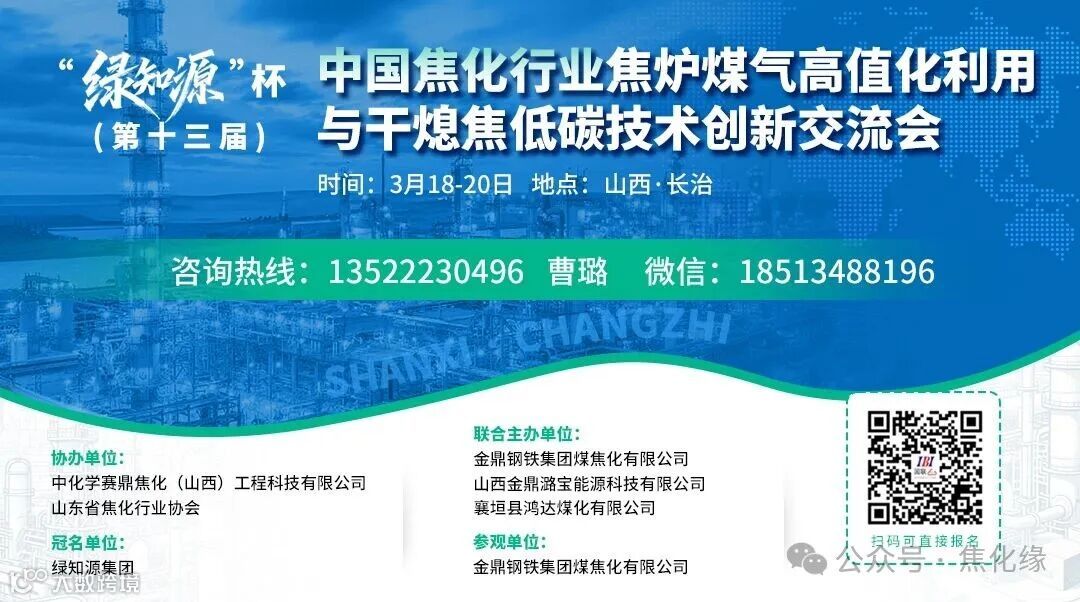 由金鼎钢铁集团煤焦化有限公司、山西金鼎潞宝能源科技有限公司、襄垣县鸿达煤化有限公司联合主办、中化学赛鼎焦化(山西)工程科技有限公司、山东省焦化行业协会协办的“2026(第十三届)中国焦化行业焦炉煤气高值化利用与干熄焦低碳技术创新交流会”将于3月18-20日在山西长治举办,参观金鼎钢铁集团煤焦化有限公司(潞宝厂区和鸿达厂区);诚邀行业界新老朋友拨冗出席!咨询热线:13522230496曹璐,微信:18513488196