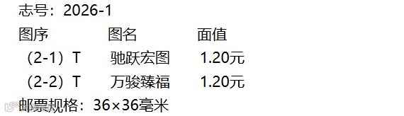 注:同时发行《丙午年》邮票版式三(整张枚数:2套4枚;整张规格:120×160毫米;边饰设计者:刘喜飞;对联作者:常江)。计划发行数量:288万版。用于赠送给预订2026年全年纪特邮票的预订户