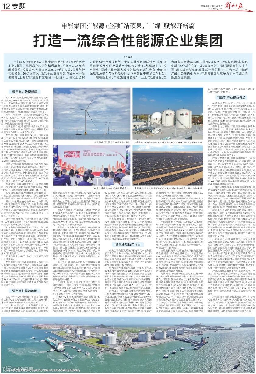 “十四五”收官之际,申能集团围绕“能源+金融”两大主业,书写了能源绿色转型的精彩篇章。站在“十五五”新起点,集团将以“三个绿色”为主线,着力打造具有国际竞争力的一流综合性能源企业集团。2月3日,《解放日报》进行了专题报道。