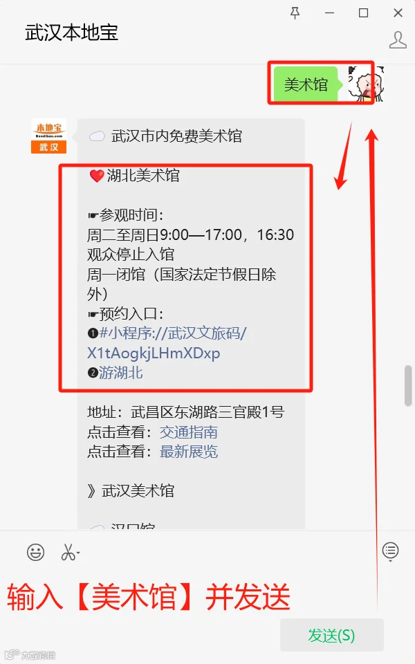在聊天对话框回复【美术馆】