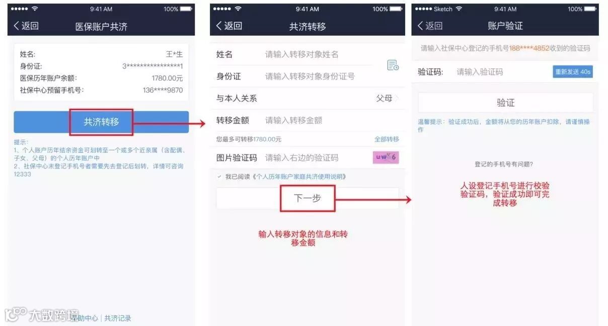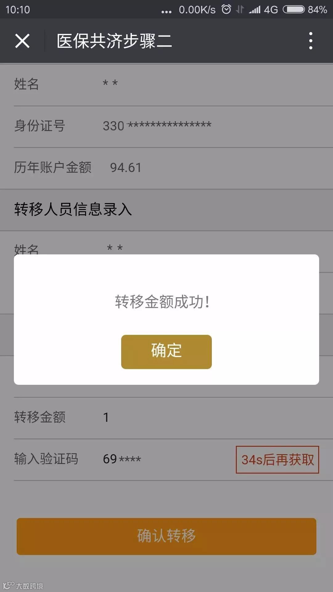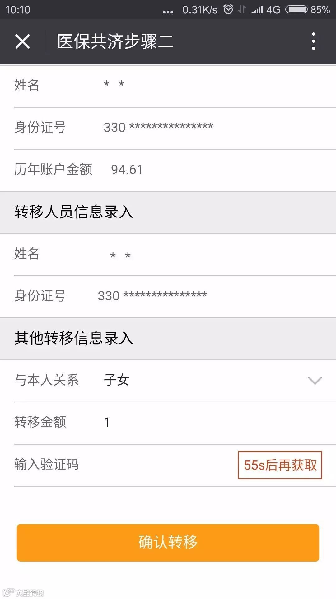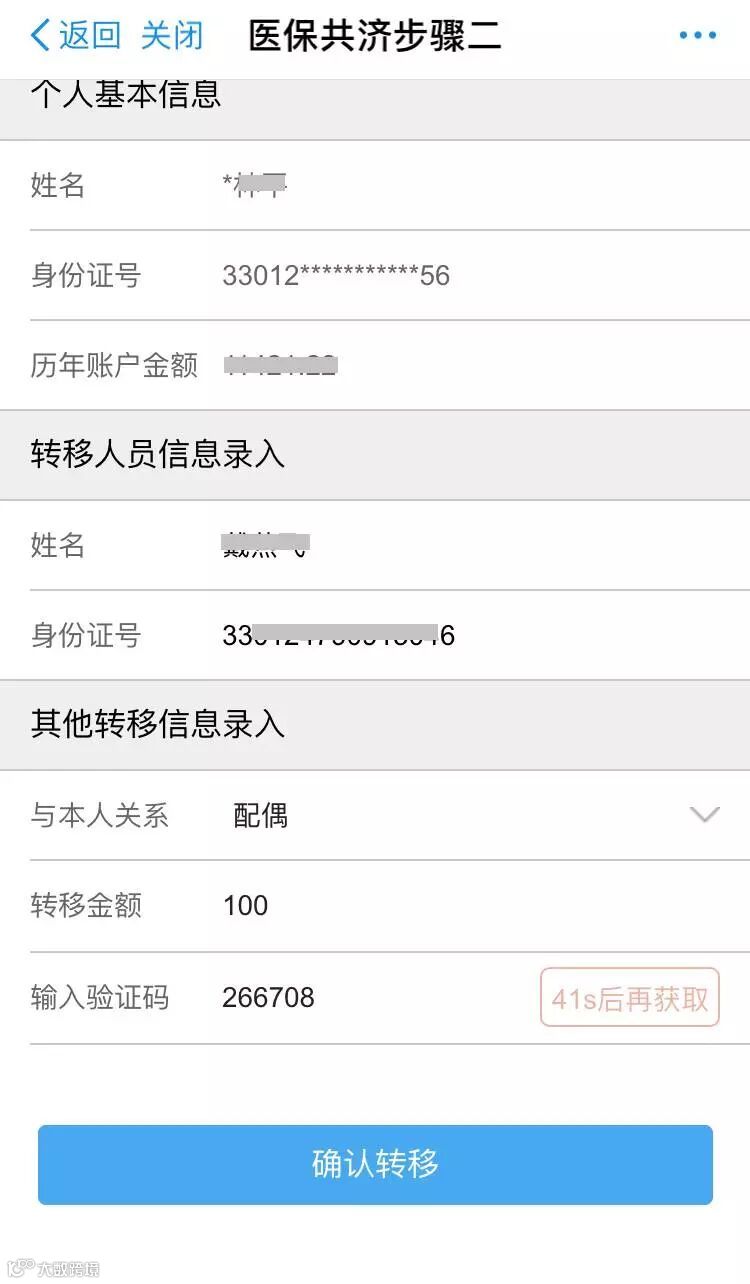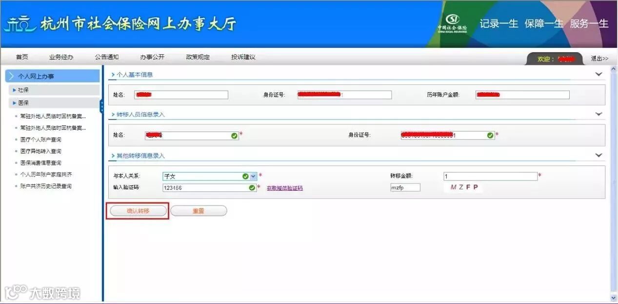 - 填写被转移人信息及验证码,确认划转;